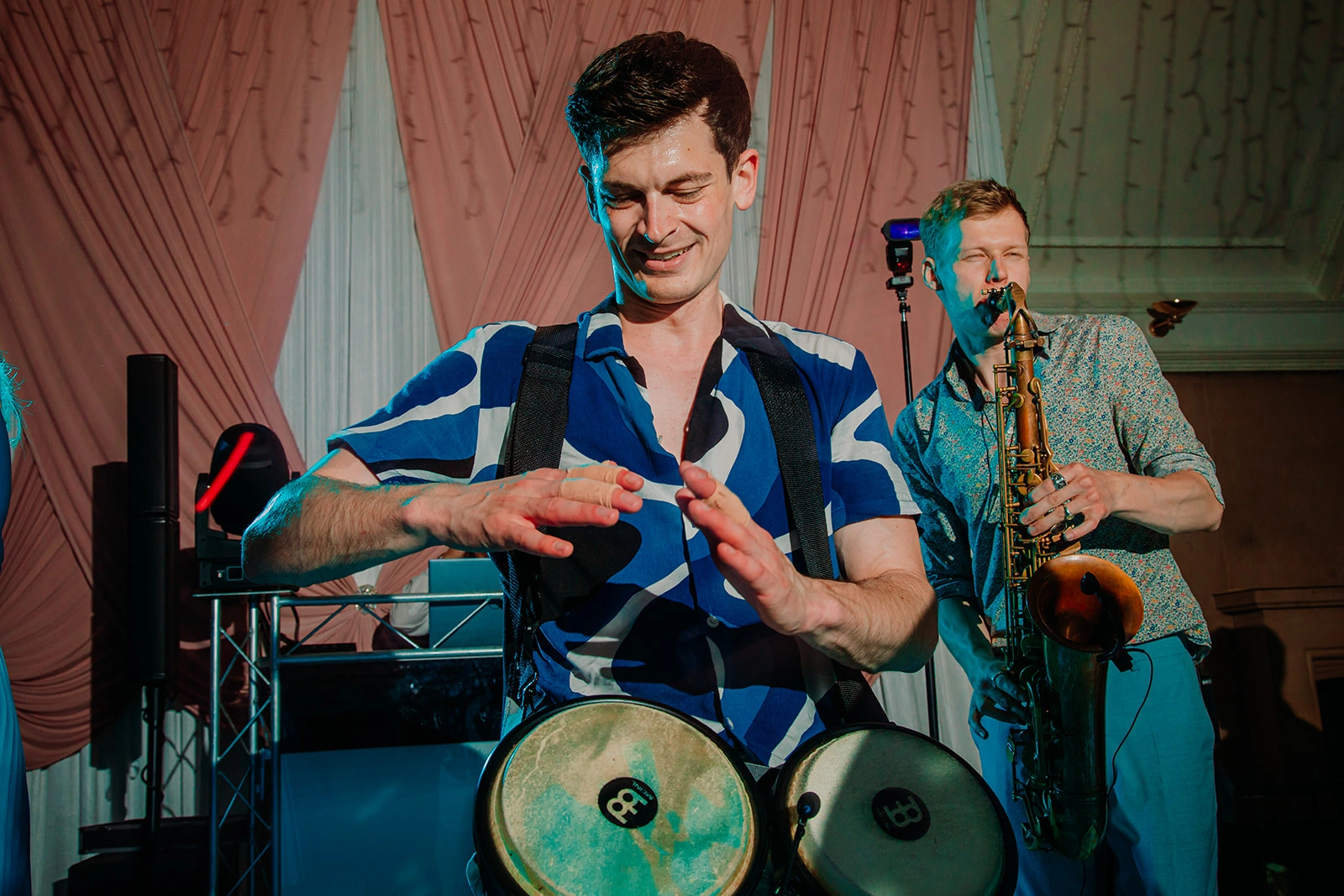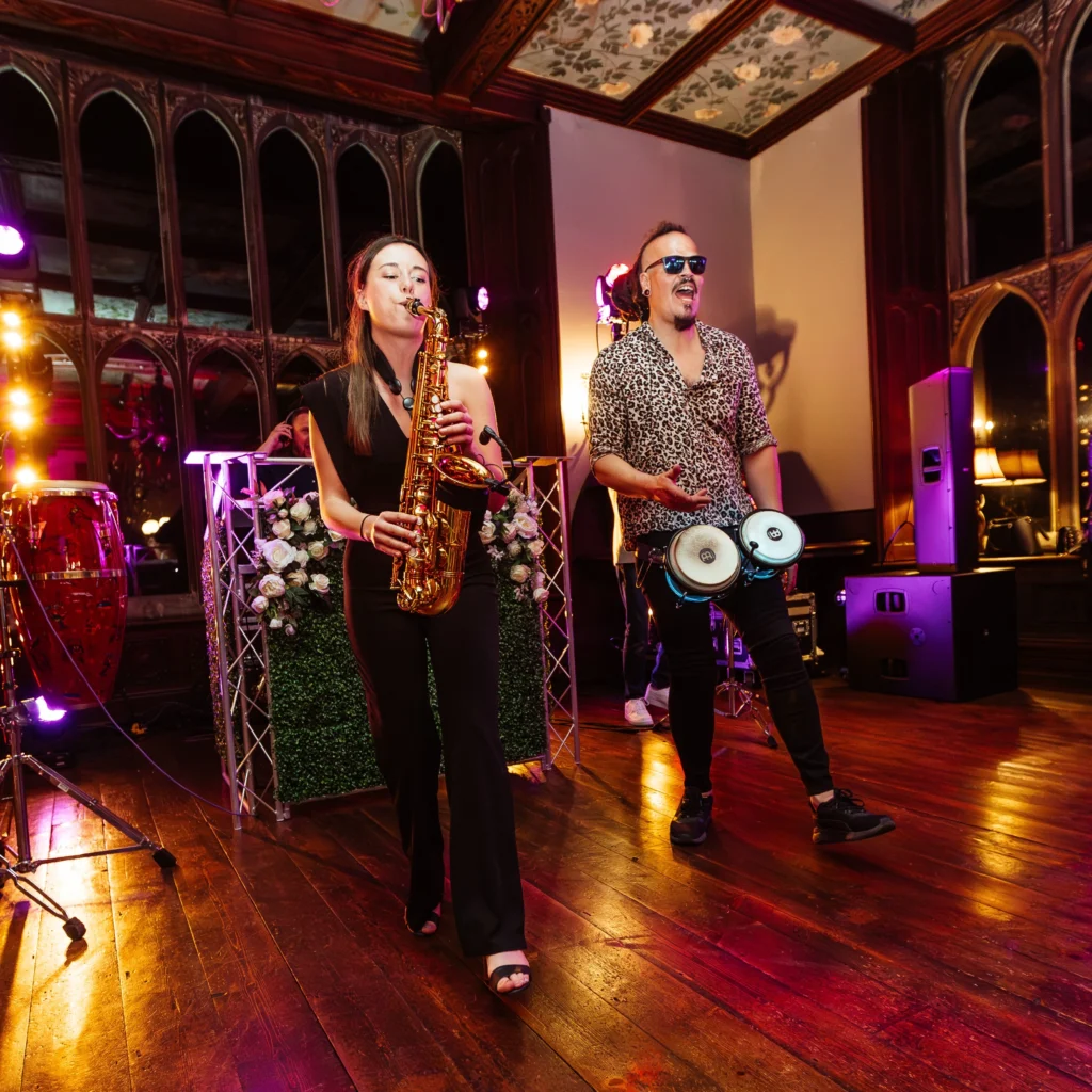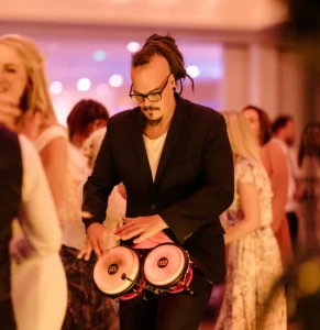 This is about rhythm, interaction and physical energy. A wedding bongo player doesn’t stand back and play along, they’re out with your guests, driving the beat, reacting to the music and pulling people deeper into the moment. Combined with my live-mixed DJ sets, it creates a more intense, hands-on atmosphere that lifts the room instantly.